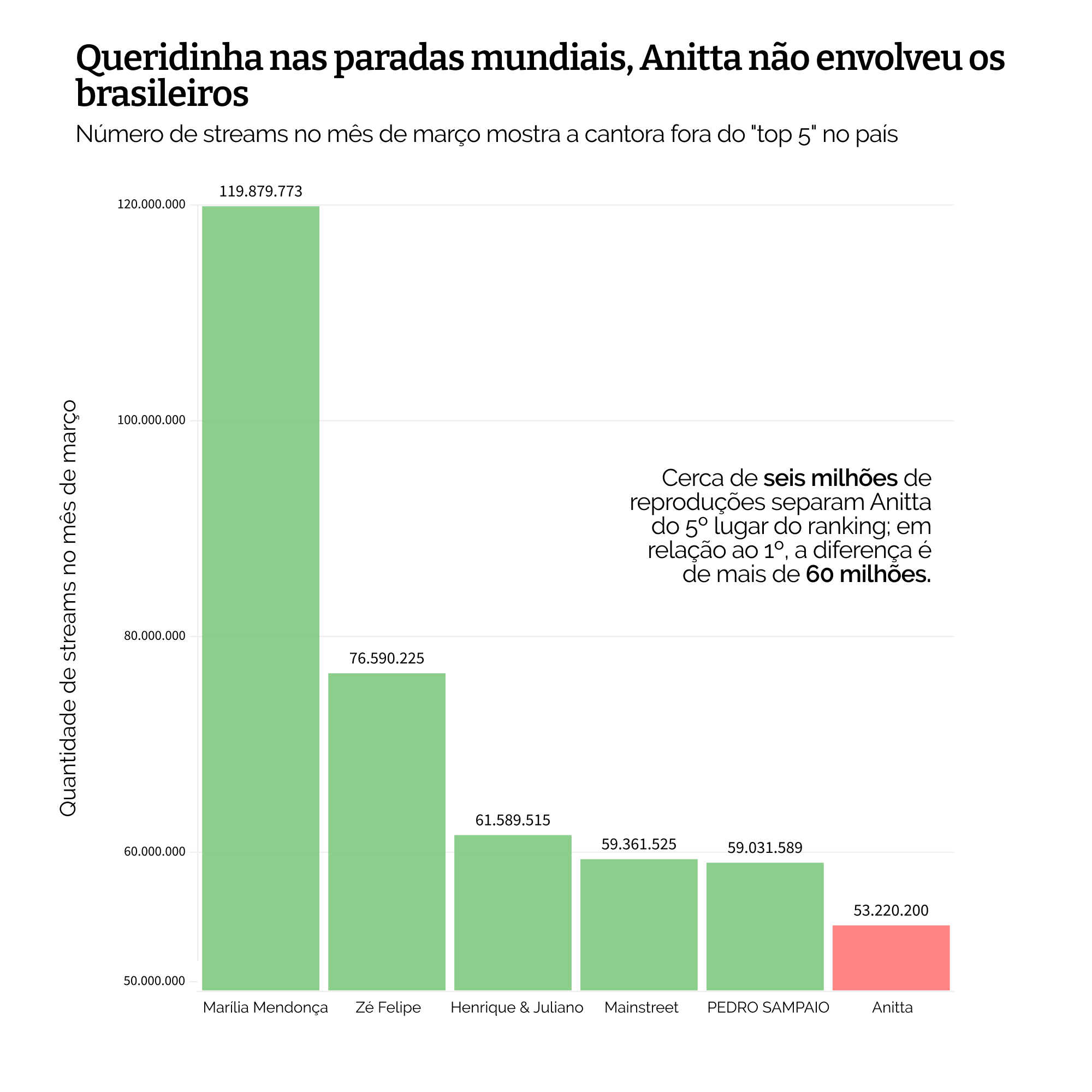 A partir dos dados do Spotify Charts, produzi um gráfico para passar a mensagem de que a cantora Anitta, apesar do sucesso mundial recente e chegada ao #1 do Spotify Global, não fez tanto sucesso entre os brasileiros.