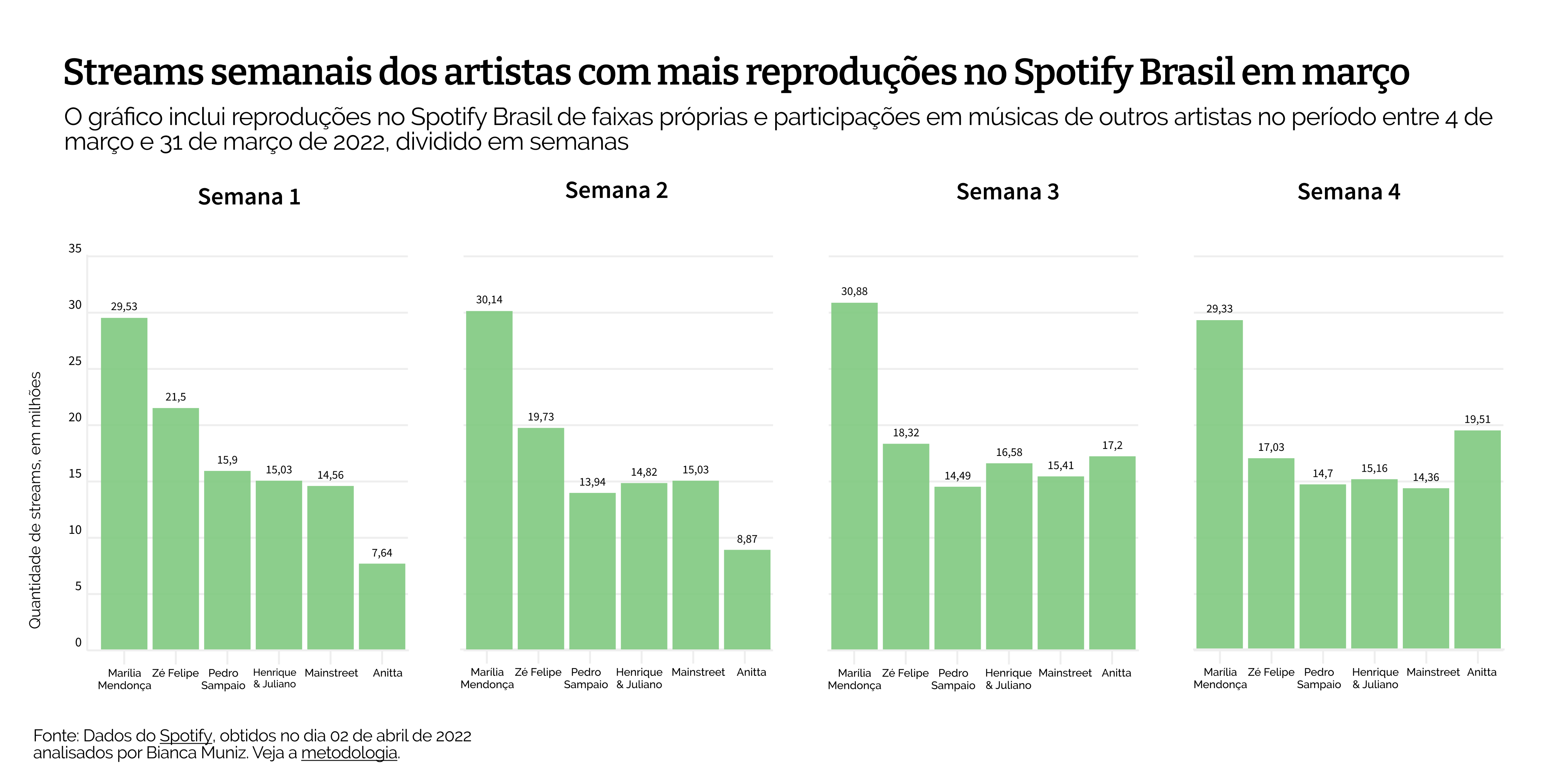 - Não há informações metodológicas: apesar de não ser uma manipulação, entender como foi feita a análise e a origem dos dados é importante para compreender o gráfico. Uma informação não colocada é que foi incluída as músicas próprias de cada artista (por exemplo, “Envolver” e “Boy’s don’t cry”, da Anitta) e participações em faixas de outro artista (como a música “No chão novinha”, do Pedro Sampaio ft. Anitta);